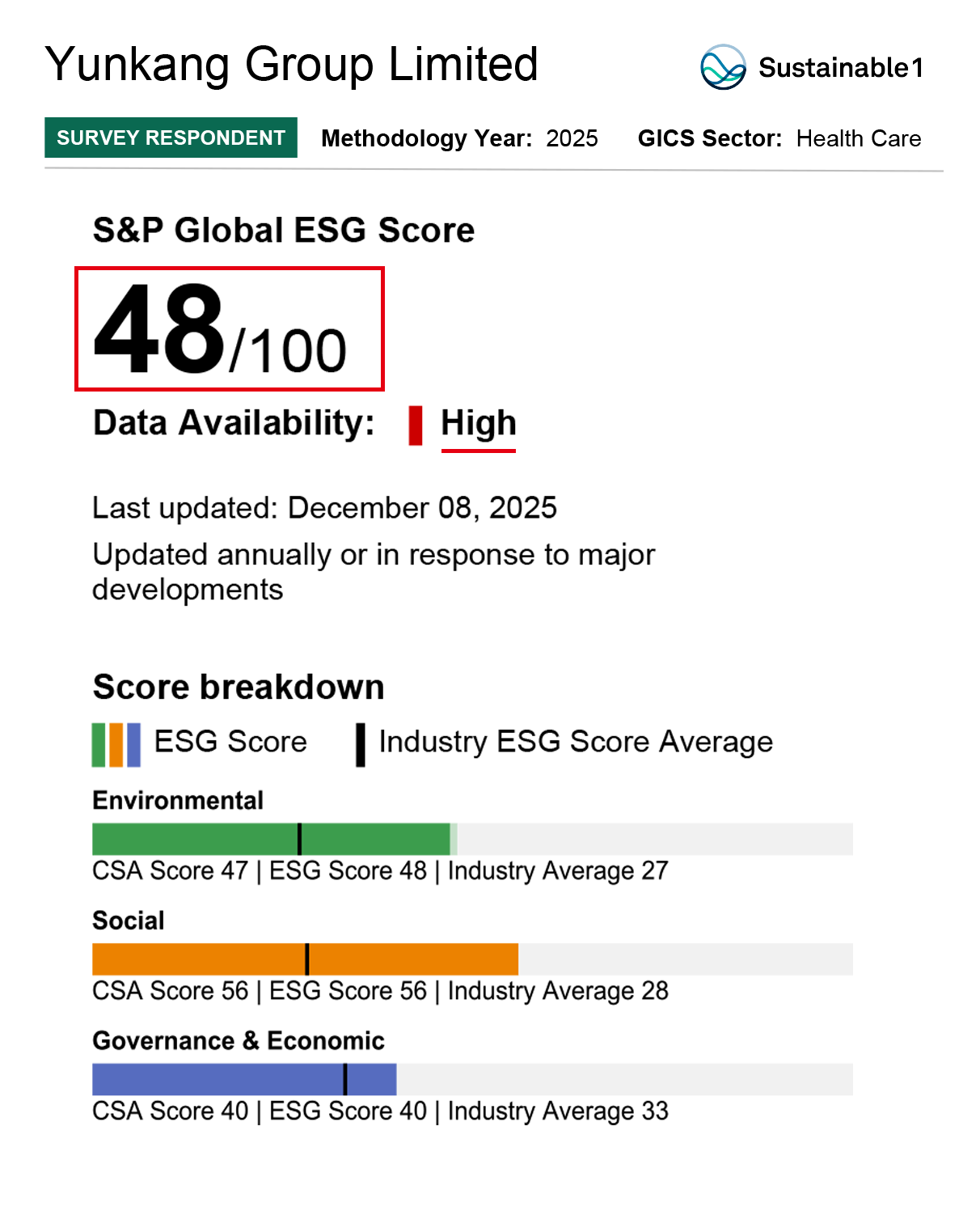 近日,国际顶尖评级机构 S&P Global(标普全球)重磅发布 2025 年度企业可持续发展评估(CSA)结果,云康集团 ESG 得分攀升至 48 分,较去年劲增 5 分,实现年度跨越式增长。这一亮眼成绩不仅彰显了云康在环境、社会及管治(ESG)领域的硬核实践,更斩获全球资本市场的高度认可,标志着集团可持续发展之路迈入高质量进阶新阶段。