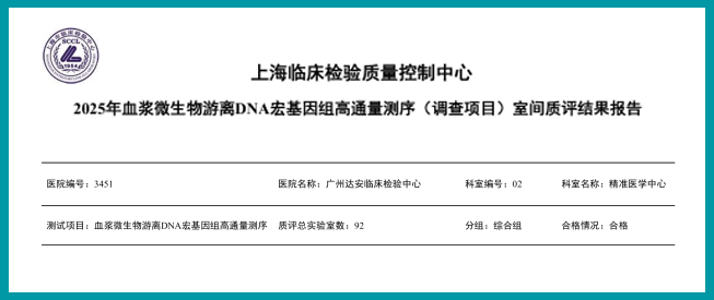 近日,上海临床检验质量控制中心发布《2025 年血浆微生物游离 DNA 宏基因组高通量测序(调查项目)室间质评结果报告》,云康集团・广州达安临床检验中心在此次室间质评中取得优异成绩,再次印证了其在病原微生物宏基因组(mNGS)检测领域的技术稳定性与质量管理水平。